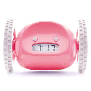 • Run Away Automatically: Hide and Seek Runaway Alarm Clock is the fun and crazy alarm clock with wheels. He jumps from a 3-foot high nightstand, and then off he run in different directions every day, bumping into objects, changing direction again, and beeping until you wake up, get out of bed and turn him off. Works on carpet or wood!
