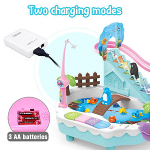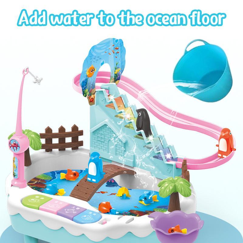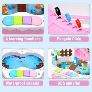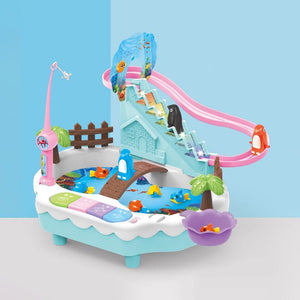 • Attached to the penguin gliding game, the little penguin climbed up the stairs and then slid down from the track, very interesting.