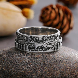 Wolf and she-wolf rings are a symbol for him and her. A proud wolf and a she-wolf among hilly mountains and beautiful landscapes. The starry sky rises above them. And the tops of the mountains are framed by "snowy" cubic zirconia.
