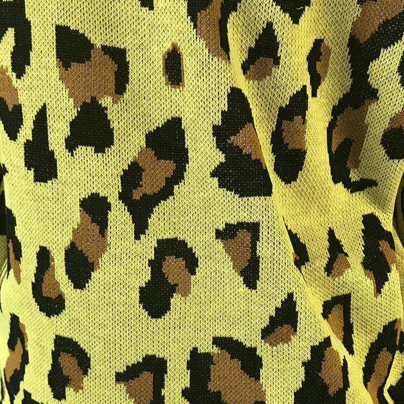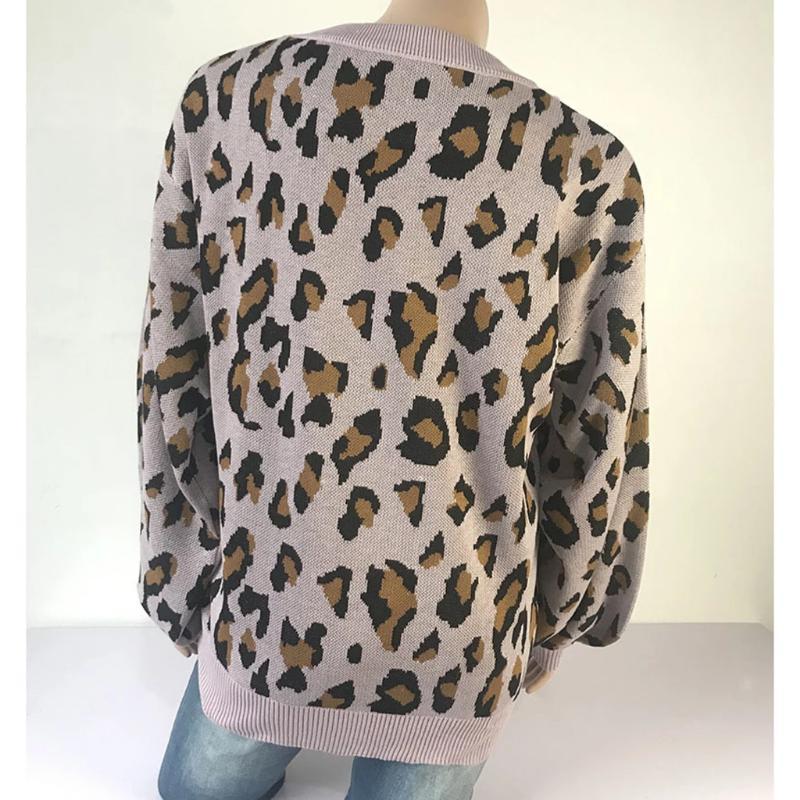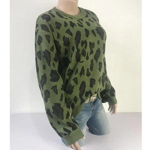 Women Long-sleeved Round Neck Solid Leopard Sweater