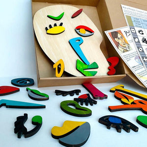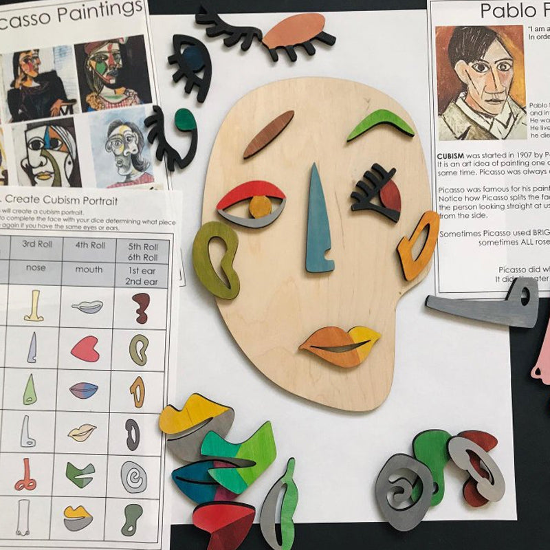 • Packet: Paper about Pablo Picasso, Paper with artist's paintings and 26 wooden parts (face, 6 noses, 6 eyes, 6 mouths, 6 ears, 2 eyebrows. )